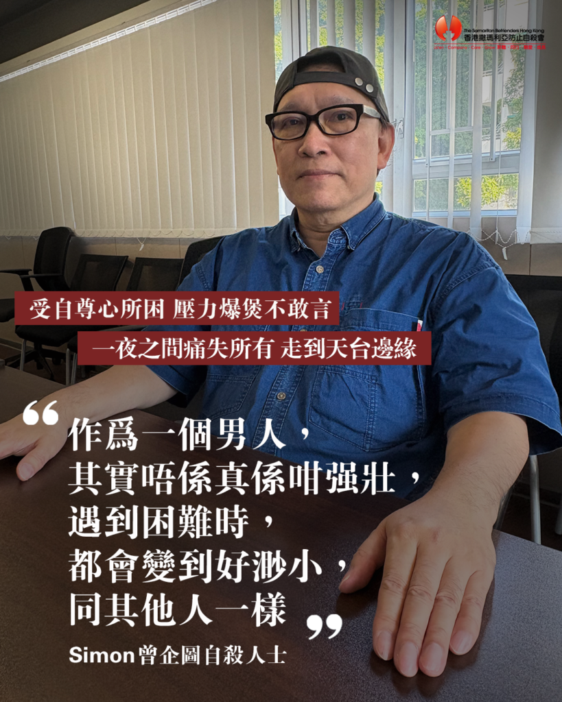 Simon的故事,相信也是不少香港男士的縮影。他們習慣了堅強,卻忘了自己同樣可以軟弱;他們勇於承擔,卻害怕成為別人的負擔。你的支持,能幫助我們在他們最絕望的時刻,給予及時的情感支援